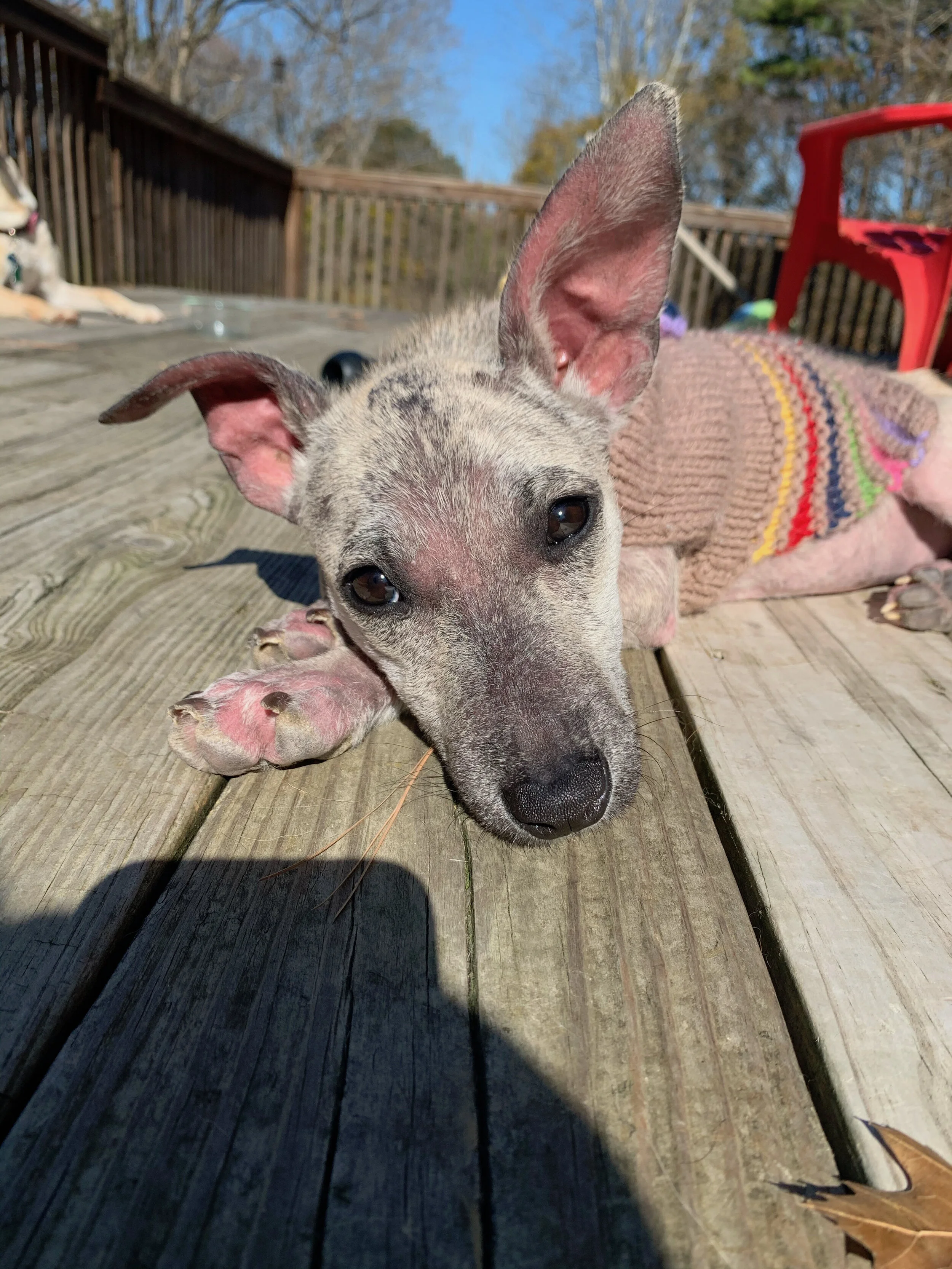 I met Queen P a month ago when I visited Amber Reynolds at her Halfway Home for Rescued Animals in Greenfield, TN. Pearl had been dumped on a remote country road surrounded by nothing but thick woods and cotton fields. I’m not sure how long she was fending for herself but it must have been a long time; she was severely emaciated and had the worst case of demodex mange I’ve seen since I visited Cuba. Her mange was so bad that it affected her growth, specifically the ligaments in her wrists, which bend like she’s double-jointed or severely flat-pawed.